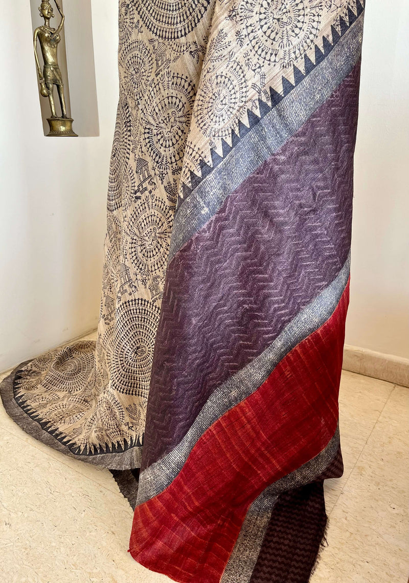 This Tussar silk saree beautifully merges tradition with bold design. The silverish grey border features small temple motifs, adding a touch of heritage. The body of the saree is adorned with intricate village art, telling a story through its detailed patterns. The aanchal contrasts in brownish purple and red, with bands of silver grey, creating a stunning visual effect. Draping with ease, the saree enhances your silhouette while making a statement. Perfect for festive occasions or cultural events, it pairs effortlessly with both contemporary and traditional blouses, showcasing the beauty of craftsmanship and culture.